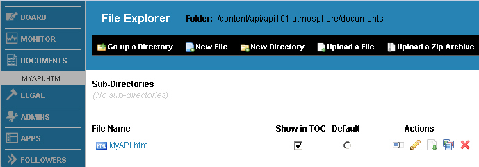 - In the installation directory of the platform tenant, a /documents and /legal directory are automatically created as part of the adding the API using the Add a New API Wizard. These directories can be viewed when you launch File Explorer in the API > Documents or API > Legal sections of the platform.