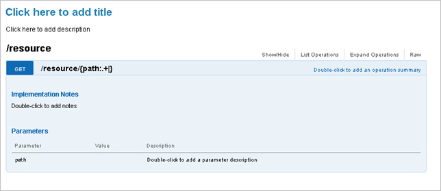 - Methods—You can add documentation for RESTful services using the Swagger UI add-on that is integrated into the API > Documents section. When you add a RESTful service using the Add a New API Wizard, the system adds the methods/operations defined in the API to a pre-defined system template composed of Swagger HTML, JavaScript, and css assets. You can then add your documentation content and configure what aspects of the API documentation you would like to show or hide based on the state of your current API.